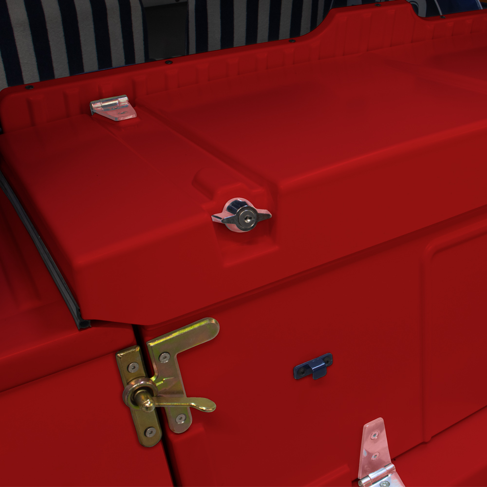La copertura per bagagliaio in PMMA rosso brillante per Méhari permette di chiudere e mettere in sicurezza il bagagliaio della Méhari creando uno spazio bloccabile tra il sedile posteriore e il portellone.