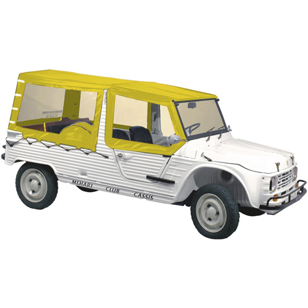 Questo set di capote è progettato per i modelli Méhari dotati di parabrezza in alluminio (con angoli rettangolari). Si monta utilizzando le staffe per capote, codice articolo 07005000. Esclusivo per la 2CV Méhari Club Cassis, questo set di capote originale è interamente realizzato a mano nel rigoroso rispetto delle specifiche storiche Citroën.